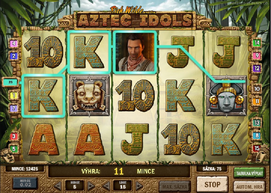 Aztec Idols är ett 5-hjuls videoslot. Du kan aktivera upp till 15 linjer och satsa upp till 5 mynt/linje. Linjerna måste spelas i ordning (1,2,3,4, osv.). Aztec Idols inkluderar en jokersymbol (Rich Wilde), en spridd bonussymbol (pyramiden) och en spridd-symbol för gratisspinn (solstenen). Jokersymbolen ersätter för alla andra hjulsymboler (förutom bonus- och gratisspinnsymbolerna) och kan användas till att skapa vinstkombinationer. Tre bonussymboler var som helst på hjulen startar Välj-statyett-bonusen där du väljer gyllene statyetter. Varje statyett ger dig en summa. Om en statyett är riggad som en fälla och giftig gas släpps ut är bonusspelet slut.