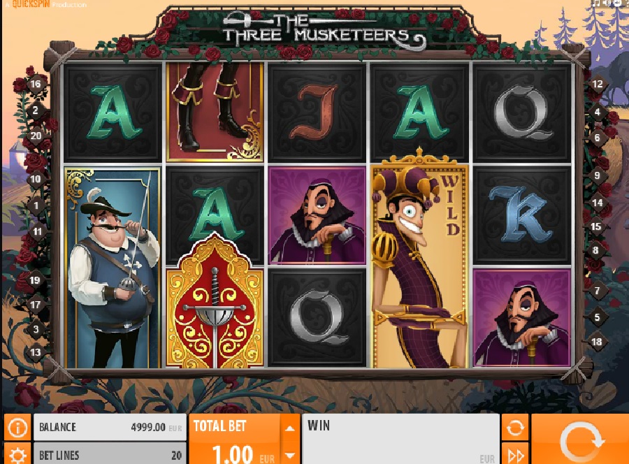 The Three Musketeers är en spelautomat med 5 hjul, 3 rader och 20 vinstrader. Spelet innehåller frispel med jokermultiplikator, jokersymbolstöt och funktionen Alla För En. Den teoretiska utdelningen är 96,64%.